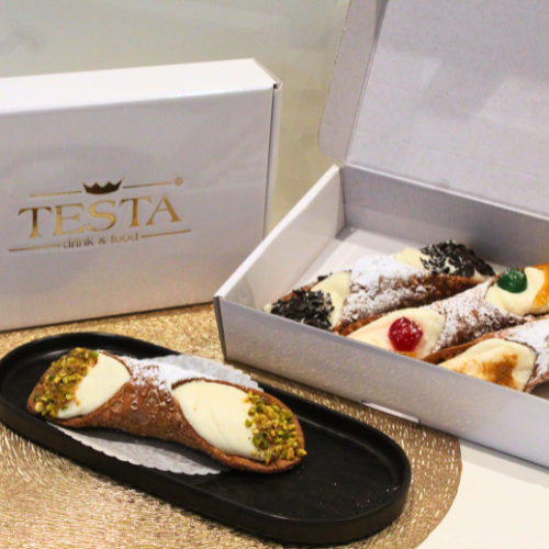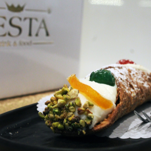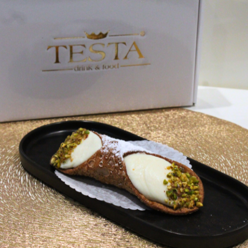 Croccante cialda artigianale farcita con ricotta di pecora fresca, finemente lavorata e guarnita con frutta candita.